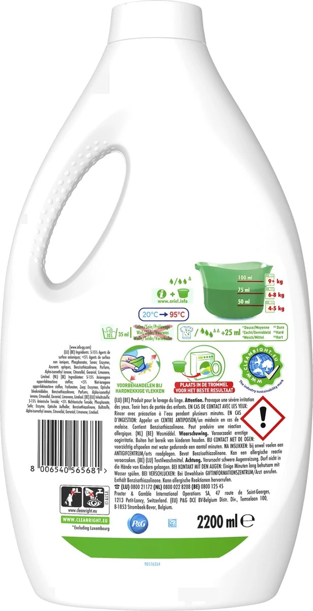 - Recyclebare verpakking: Ariel vloeibaar wasmiddel wordt geleverd in een recyclebare verpakking