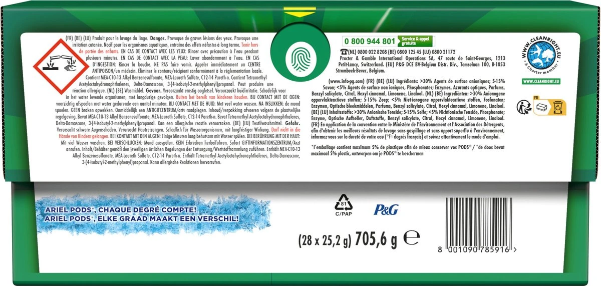 Ontdek Ariel Wasmiddel Pods + Extra Vezelbescherming. Ze hebben nu een extra paars vak, vernieuwen de glans van kleuren en beschermen de vezels. Ze zijn gemaakt in Frankrijk en ontworpen voor koud water met de unieke Cool Clean-technologie. Bij contact met water lost het laagje op om krachtige vlekverwijderende technologieën vrij te geven en Ariels diepe en sterke reiniging van All in 1 Pods + Extra vezelbescherming te bieden. Daarnaast kunnen de Ariel wastabletten nu helpen plastic te verminderen dankzij hun recyclebare Ecoclic-kartonnen doos. Het is gemaakt met 70% gerecyclede vezels en bevat maximaal 5% plastic, ontworpen om je Pods te beschermen.